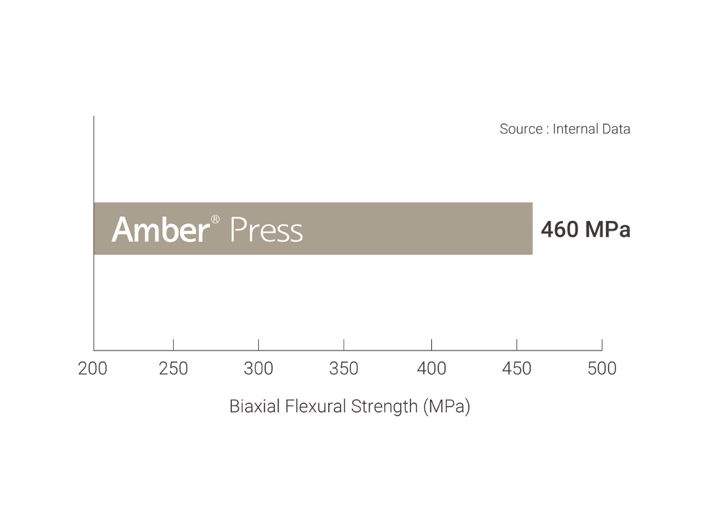 Las restauraciones fabricadas con Amber® Press alcanzan una resistencia a la flexión biaxial de 460 MPa después de la cristalización. Gracias a sus propiedades superiores, logra resultados insuperables en cada trabajo.